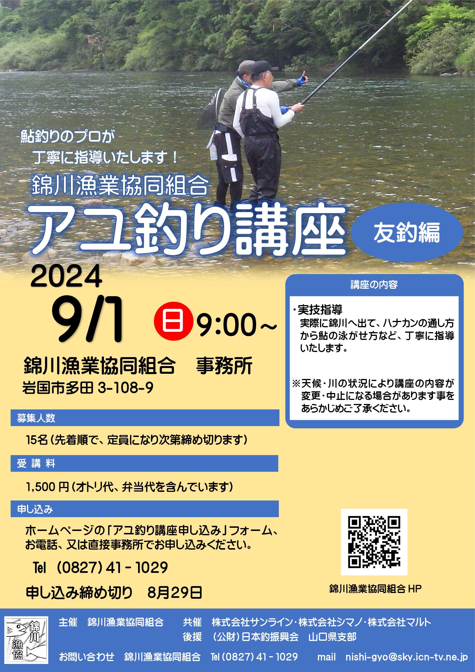 令和6年9月1日(日)9:00~漁協事務所でアユ釣り講座、開催いたします。 ・募集人数:15名(定員になり次第締め切ります) ・受講料:1,500円(オトリ代、お弁当代を含んでいます) ・申し込み:下記に必要事項をご記入の上、送信ボタンを(1度だけ)押してください。(申し込み確認後、漁協事務所より確認のメールかお電話をかけさせていただきます。3日経っても連絡がない場合、不具合の可能性がありますので、直接お電話でお申込みください。) アユ釣り講座申し込み お名前 住所 電話番号